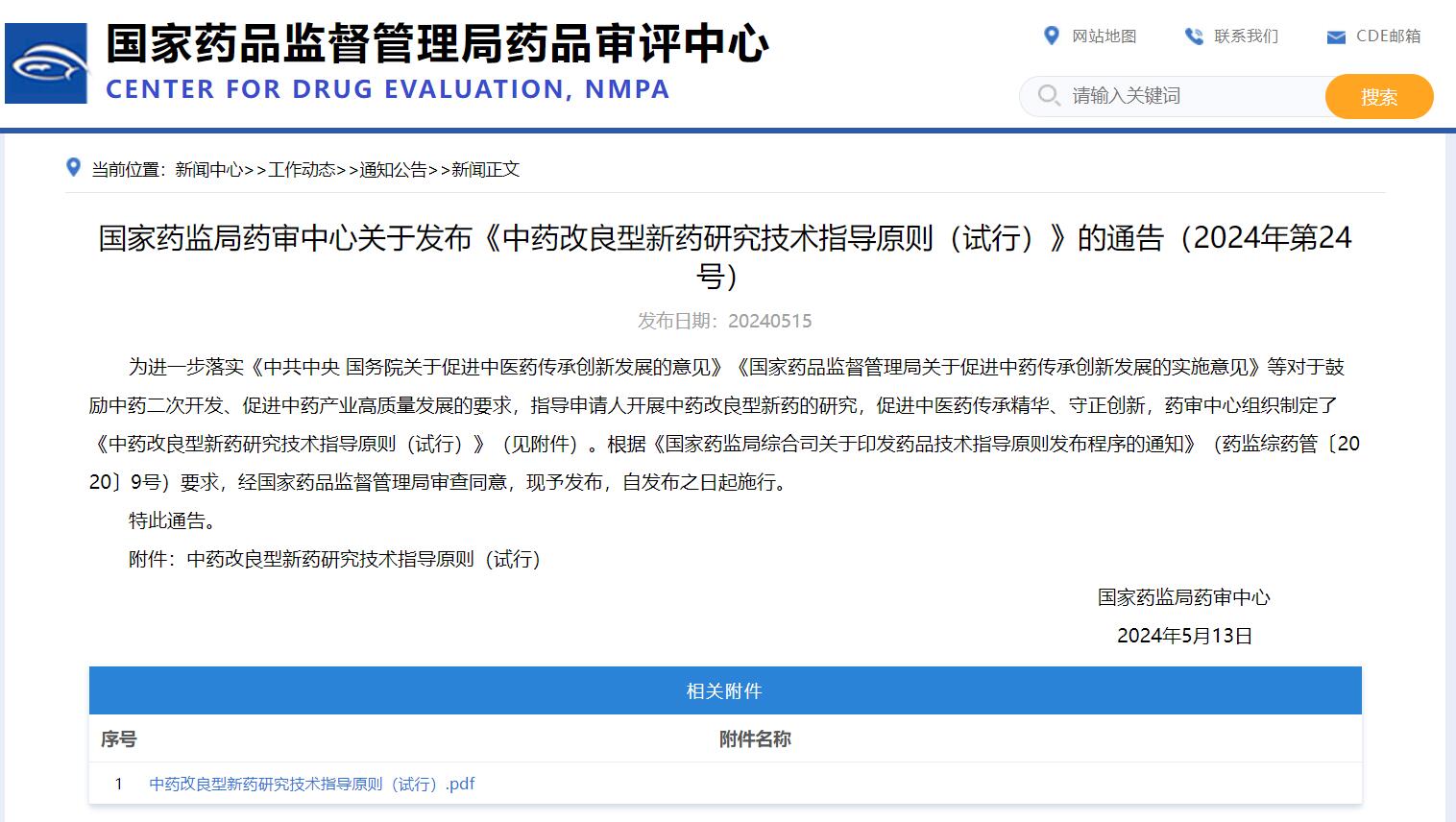 國家藥監局藥審中心關于發布《中藥改良型新藥研究技術指導原則(試行)》的通告(2024年第24號)
