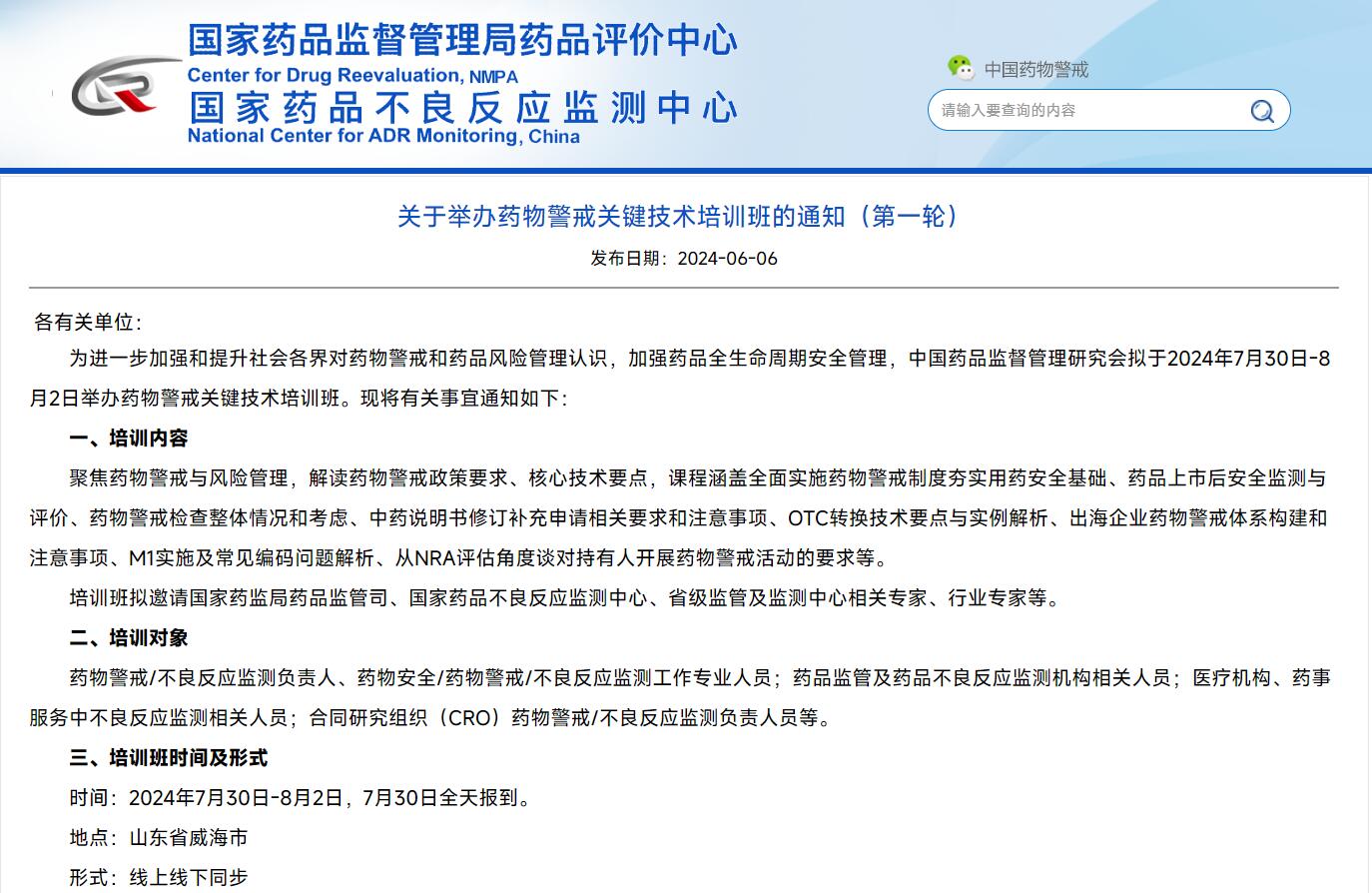 關于舉辦藥物警戒關鍵技術培訓班的通知(第一輪)