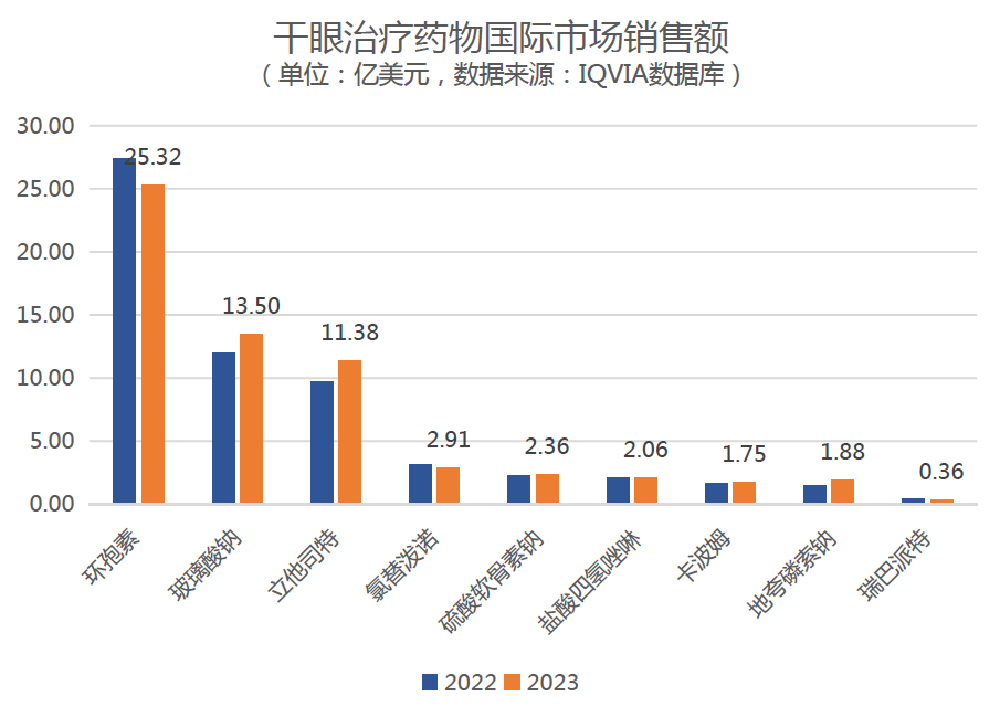 2023年,國際市場干眼癥的銷售額最高的產品變化不大,主要有環(huán)孢素(25.32億)、玻璃酸鈉(13.50億)、立他司特(11.38億)和氯替潑諾(2.91億)。從增長情況來看,增長率最快的產品分別為立他司特(+16.7%)、玻璃酸鈉(13.0%)和地夸磷索鈉(+29.7%)。