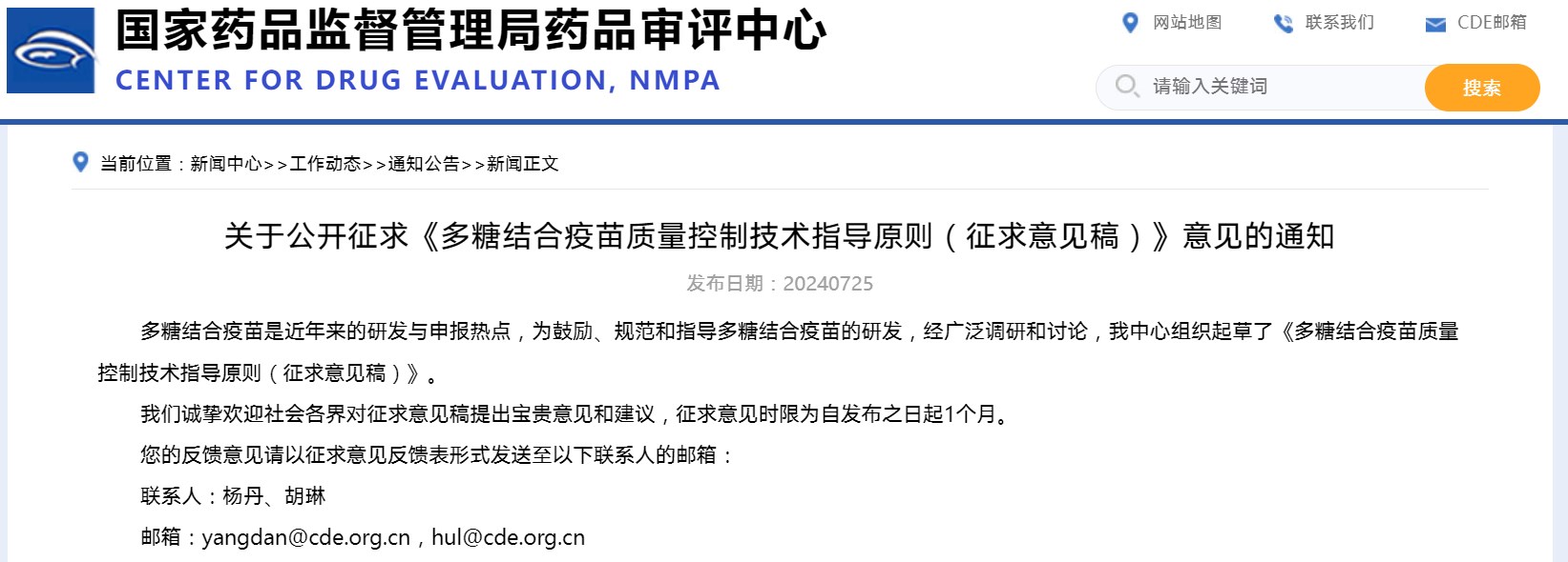 關于公開征求《多糖結合疫苗質(zhì)量控制技術指導原則(征求意見稿)》意見的通知