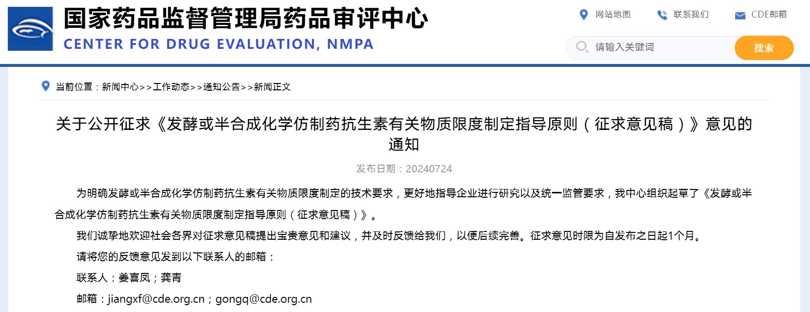 關于公開征求《發(fā)酵或半合成化學仿制藥抗生素有關物質(zhì)限度制定指導原則(征求意見稿)》意見的通知