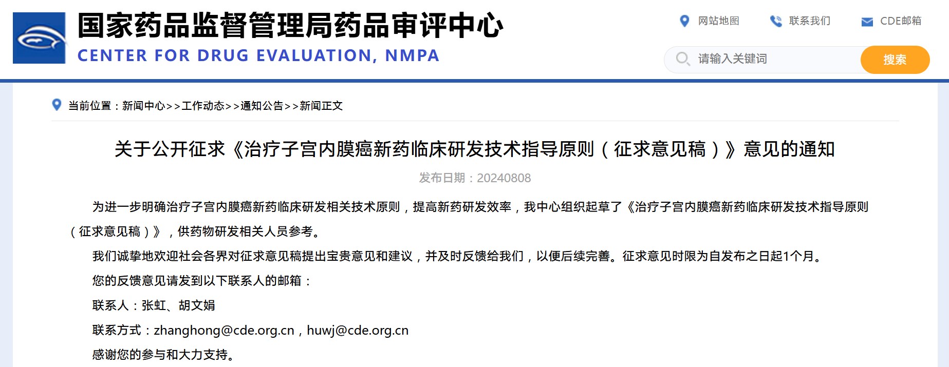 關于公開征求《治療子宮內膜癌新藥臨床研發技術指導原則(征求意見稿)》意見的通知