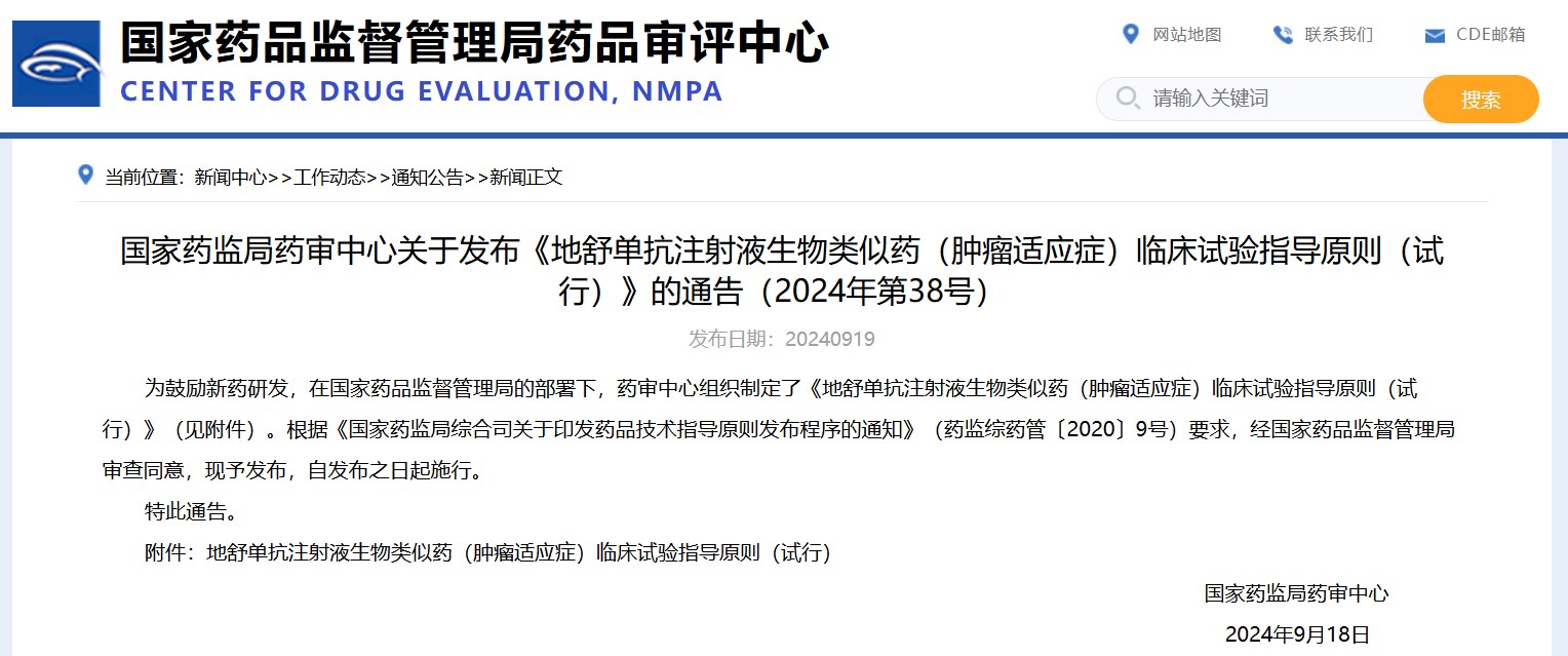 國(guó)家藥監(jiān)局藥審中心關(guān)于發(fā)布《地舒單抗注射液生物類(lèi)似藥(腫瘤適應(yīng)癥)臨床試驗(yàn)指導(dǎo)原則(試行)》的通告(2024年第38號(hào))