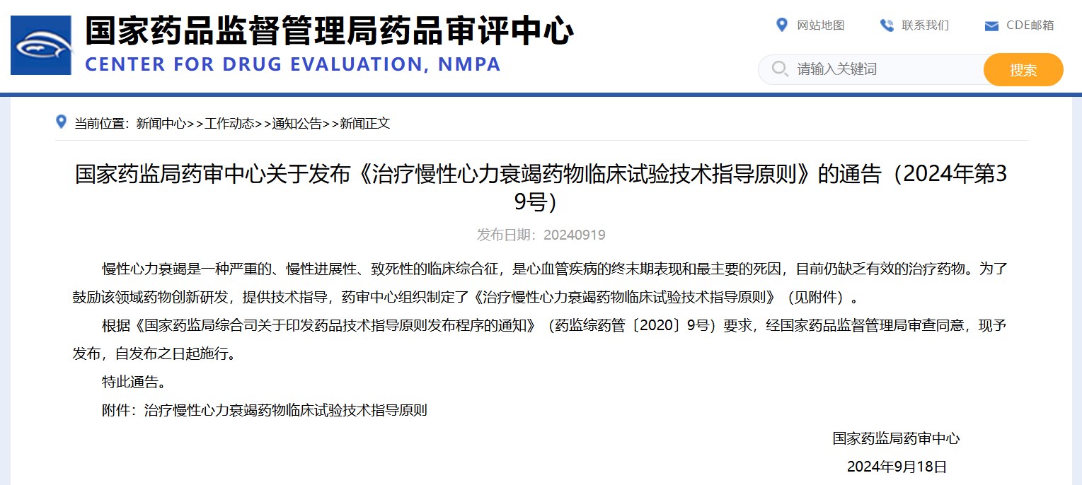 發(fā)布《治療慢性心力衰竭藥物臨床試驗(yàn)技術(shù)指導(dǎo)原則》的通告