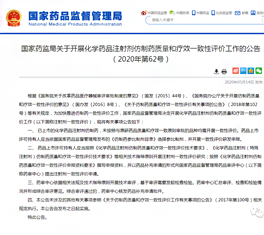 2020年5月14日,國家局一改往日習慣,在非假期前的工作日發布了重磅通告“國家藥監局關于開展化學藥品注射劑仿制藥質量和療效一致性評價工作的公告(2020年第62號)”(以下簡稱“通告”),與此同時,CDE同步發布《化學藥品注射劑仿制藥質量和療效一致性評價技術要求》 -