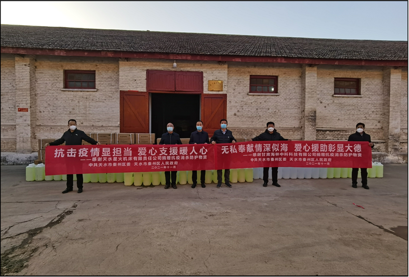 11月8日:甘肅海林中科科技股份有限公司、天水星火機(jī)床有限公司各捐贈價值5萬元的醫(yī)用防護(hù)服、隔離臉罩、隔離鞋套、N95口罩、消毒液等防疫物資。