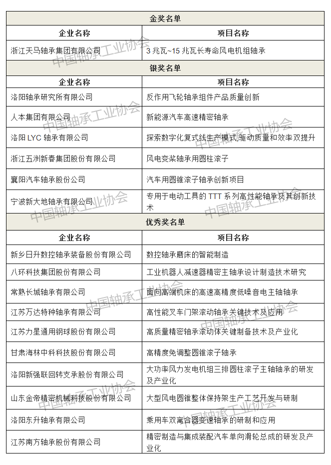 今年8月,中國機械聯合會下發了關于組織開展2021“華中數控”杯全國機械工業產品質量創新大賽的通知,經由30家協辦單位組織推薦和自行申報,共收到400多個項目。經大賽評審委員會線上初賽、專業復審、決賽評審,最終有167項產品質量創新項目獲獎。其中軸承行業多家企業產品質量創新項目獲獎,其中金獎1項,銀獎6項,優秀獎9項,公司“高精度免調整圓錐滾子軸承”產品榮獲優秀獎,獲獎名單分別如下: