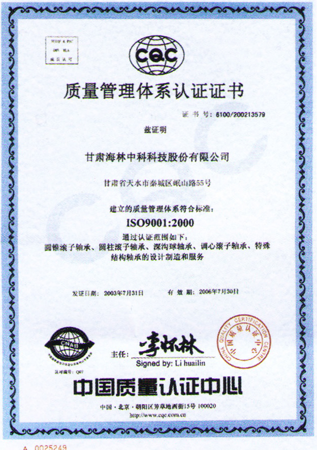 2003年通過中國質量認證中心ISO9001:2000標準換版認證