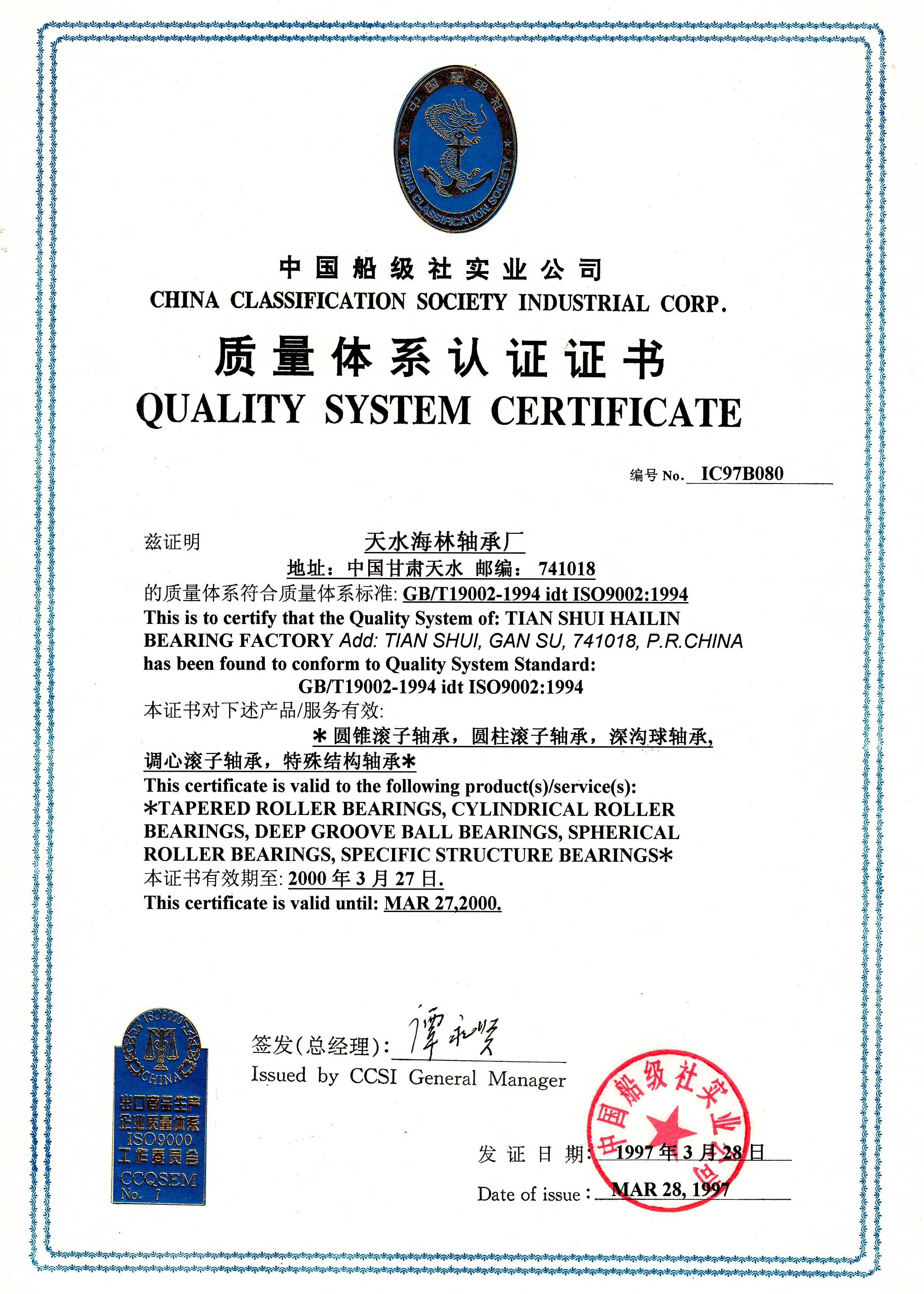1997年通過中國船級社質量認證中心ISO9002:1994標準認證