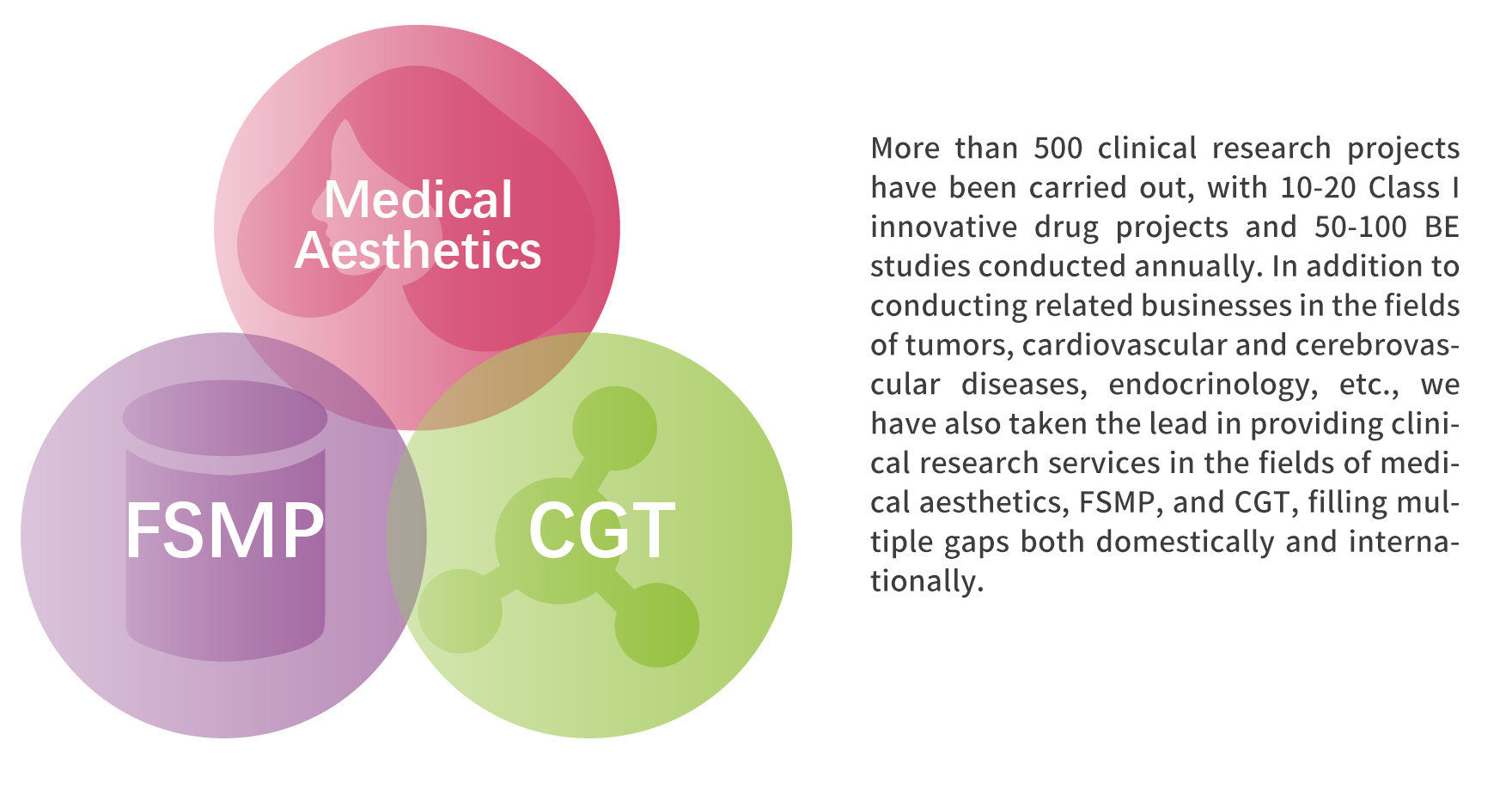 We has provided diversified R&D support clinical technical services for more than 500 well-known enterprises at home and abroad, including clinical trials of innovative/generic drugs of chemical drugs, traditional Chinese medicine, biological drugs, clinical studies of bioequivalence (BE) and pharmacokinetics (PK/PD) of generic drugs, in vivo and in vitro correlation studies (IVIVR), medical scheme design and guidance, third-party audit services, project investment and financing, etc., covering large and small molecule drugs Meet the customized needs of clinical research of different R&D enterprises, and open up the key bottleneck before new drugs are launched for domestic and foreign customers.